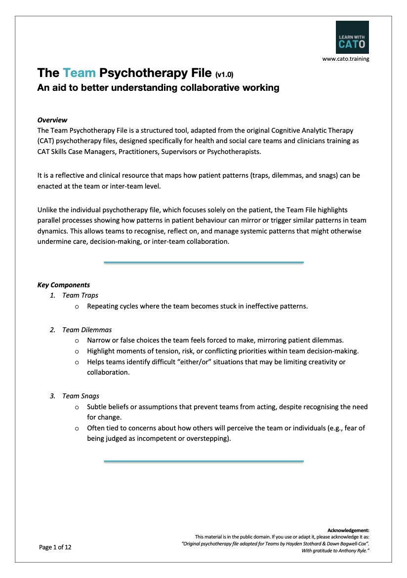 In the spirit of CAT’s collaborative roots and in recognition of Anthony Ryle’s groundbreaking work on the original Psychotherapy File, the Team Psychotherapy File is offered freely for anyone to use, share, or adapt.